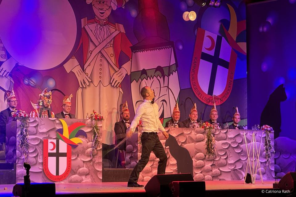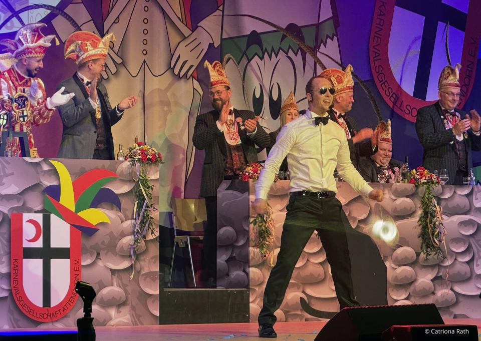 Getoppt wird diese Büttenrede 2.0 mit Kölsch & Coolness. Während die Jecken ihr Glas heben, brilliert Adrian zu fetten Bässen mit preisgekrönten Diabolo-Kunststücken von "Das Supertalent". Und der ganze Saal klatscht im Takt.