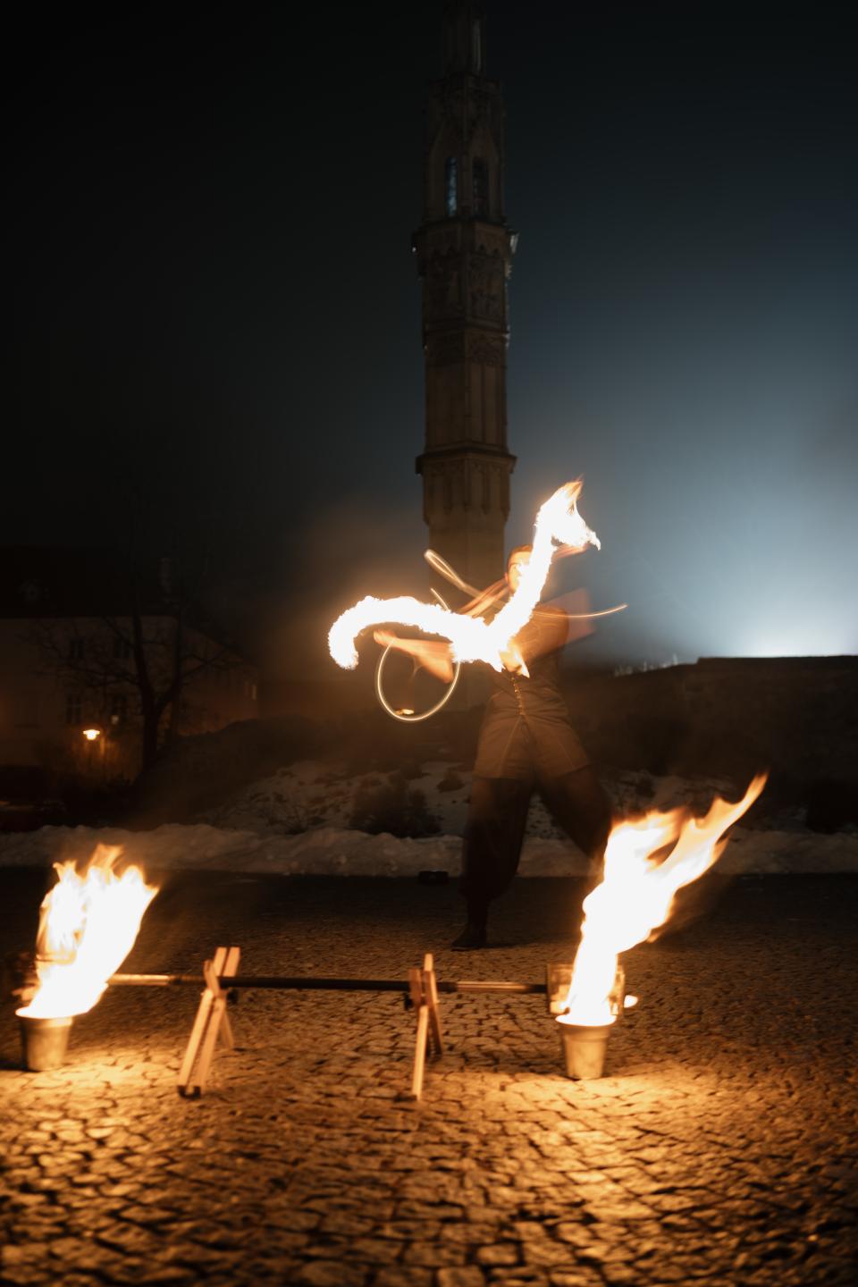 Ich jongliere seit 11 Jahren. Von Anfang an hatte ich Auftritte in der Gruppe und Übung mit Feuer. Über die Jahre habe ich mehr als 10 unterschiedliche Requisiten erlernt (In meinen Auftritten zeige ich die drei, die am besten mit Licht/Feuer aussehen).