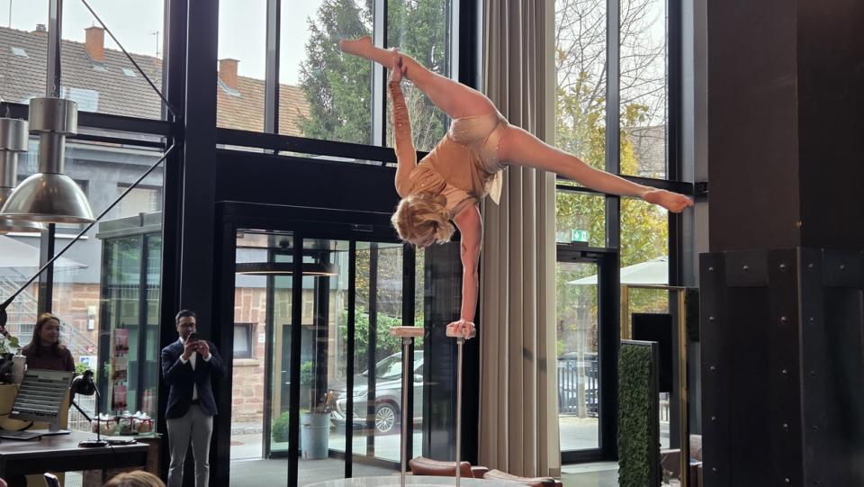 Handstand Akrobatin buchen für Galadinner, Jubiläumsfeier, Preisverleihung, Firmenevent oder Hochzeitsfeier. Crystallize ist ein einzigartiger Show Act mit einem Hauch von Klasse und Schönheit auf einem weißen Kristalltisch. Während sich die Equilibristin elegant bewegt und dreht, entstehen ungewöhnliche Bilder und harmonische Momente, die Ihr Publikum in Staunen versetzen. Mit ihrer perfektionierten Darbietung aus atemberaubender Balance, Tricks und akrobatischen Elementen begeistert die Handstandartistin ihr Publikum in ganz Europa. Crystallize kann als Show Act auch mit Tänzerinnen, Musikerinnen oder Luftakrobaten kombiniert werden.