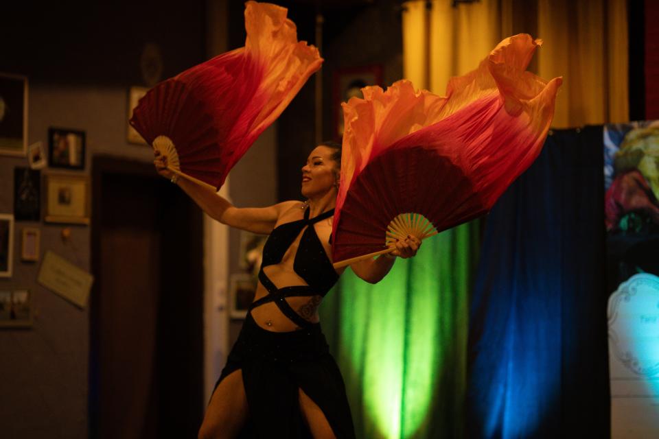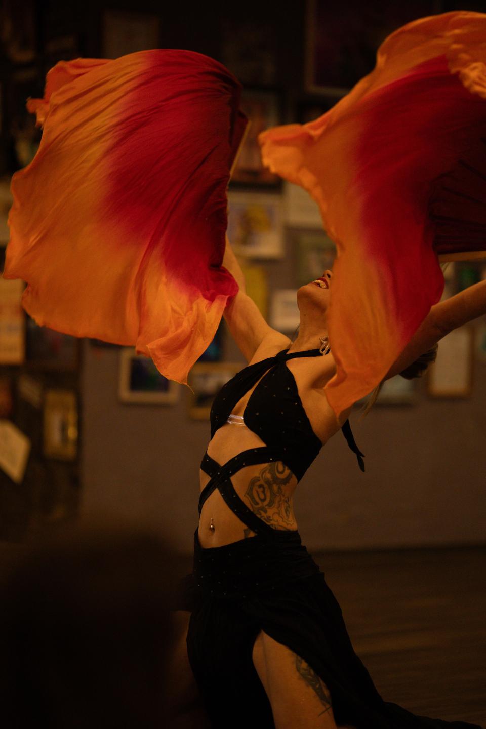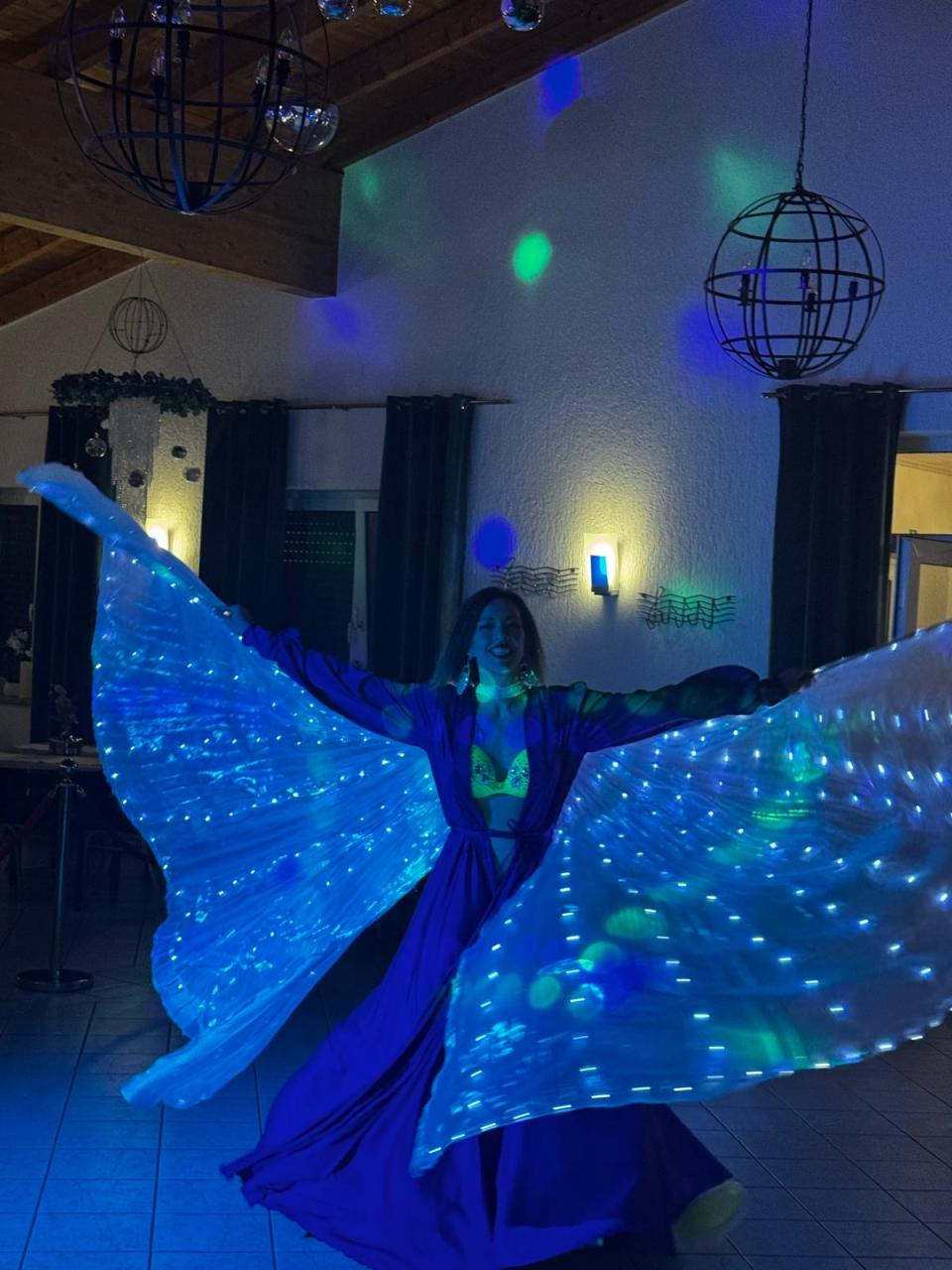 *… ein gefühlvolles Intro, meist mit Accessoire: (Doppel-) Schleier, (LED-) Isis-Wings, (LED-) Fächerschleier…