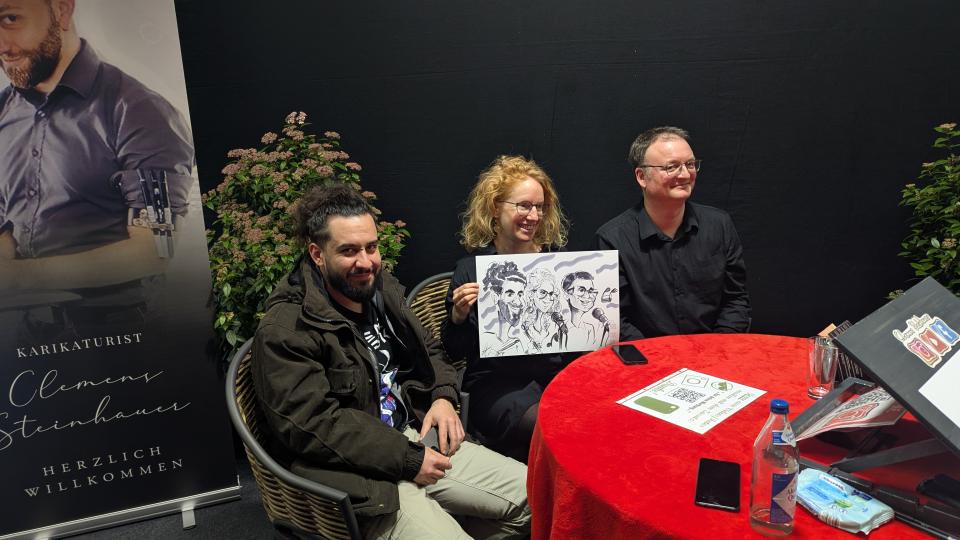 Ich schaffe innerhalb weniger Minuten ein lustiges Abbild der zu karikierenden Person, während andere dabei zuschauen können.