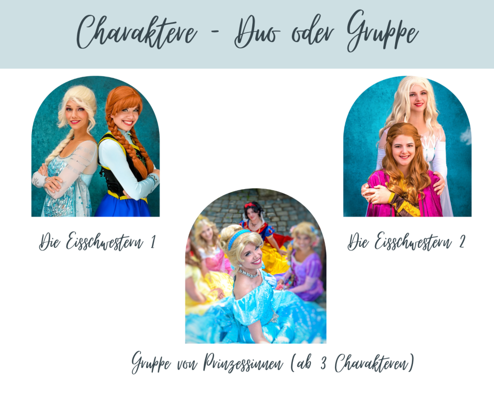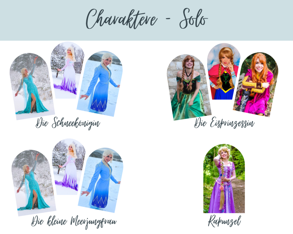 - Schneekönigin - Eisprinzessin - Eisschwestern - Die kleine Meerjungfrau - Rapunzel - Blumenfee - Seifenblasenfee - Tinkerbell - Piratin -