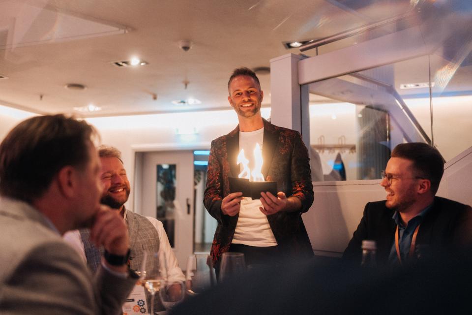 Durch meine Leidenschaft für das magische Entertainment werden Sie und Ihre Gäste niveauvoll unterhalten und verzaubert. Ich gehe von Tisch zu Tisch und zeige den Gästen hautnahe Magie, die durch meine freche und flinke Fingerfertigkeit entsteht.