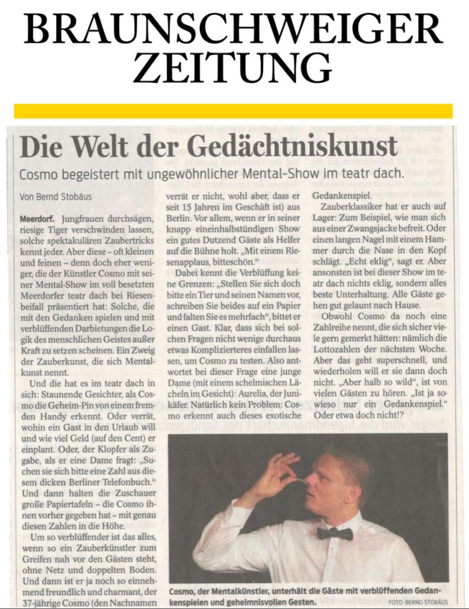 Es gibt Künstler, die Instrumente spielen. Cosmo kann kein Instrument spielen, aber dafür spielt er ganz gut mit den Gedanken der Zuschauer. Cosmo ist ein Gedankenspieler. Lassen Sie sich von Cosmo entführen auf eine Reise in die Welt der Mental- und Gedächtniskunst. Eine Welt, in der die Logik außer Kraft gesetzt wird.