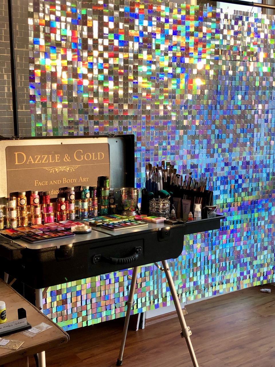 Unsere talentierten Body Art Professionals und Glitter Artists kreieren an der Glitter Bar glamouröse Looks, die mit Liebe zum Detail auf deine Persönlichkeit und deinen Stil abgestimmt sind. Die Gäste erwartet eine professionelle Beauty-Station, gefüllt mit den schönsten Makeup-Farben und Glitzerprodukten für Gesicht, Haar und Body.