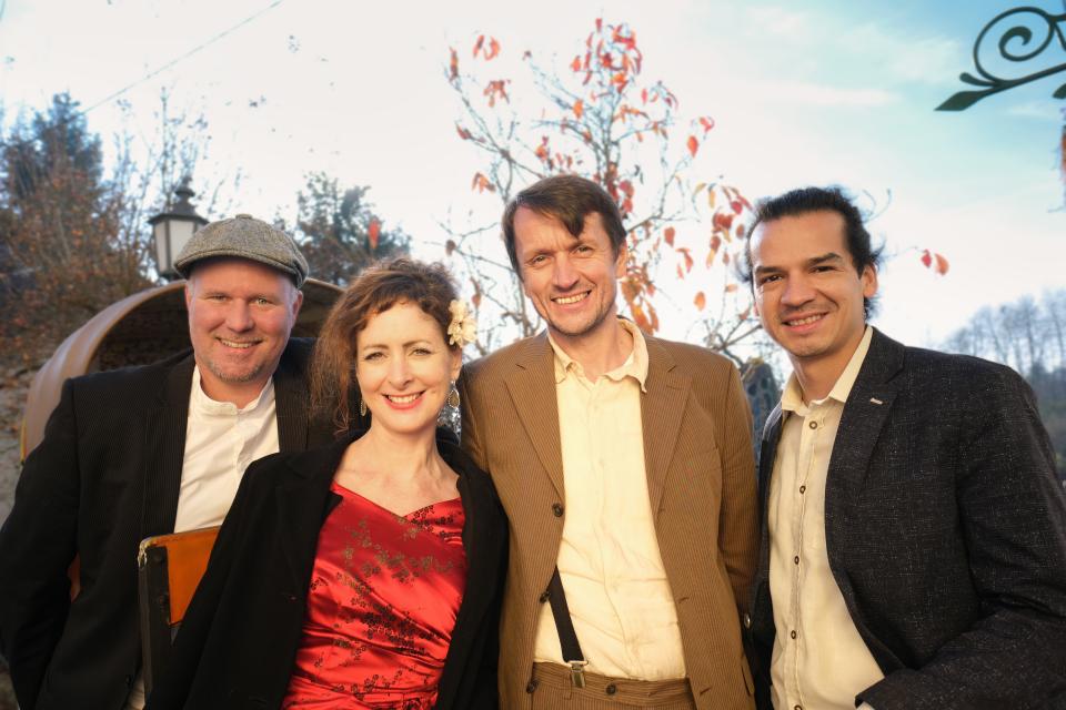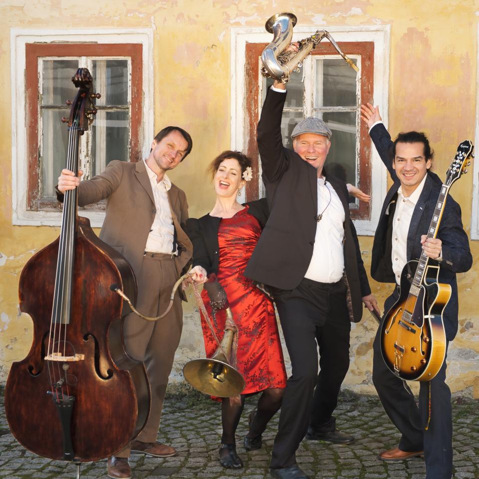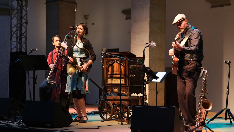Gesang, Drehorgel, Saxophon, Gitarre und Kontrabass
