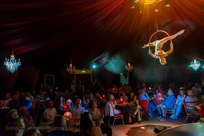 Wir arbeiten sowohl auf der Bühne als auch in der Luft. Solo Ring ab 2 Meter Höhe, Aerial Straps ab 6,5 Meter Höhe. Auch Solo Silk ab 4 Metern Höhe.