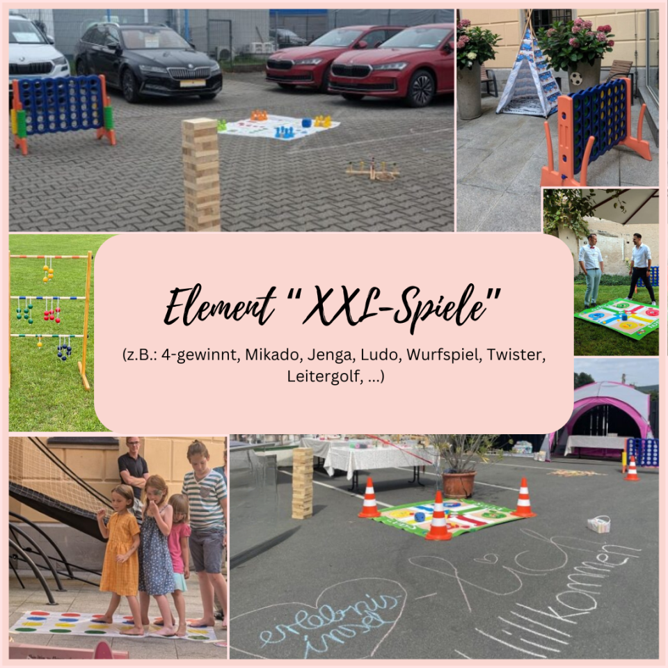 - einzelne Spielmodule, wie XXL-Spiele (Mensch-ärger-dich-nicht, Jenga, Mikado, 4-gewinnt, Leitergolf, Tic Tac Toe, Wikingerschach), Outdoorspiele, Schwungtuch, Fußballtore- und trainingsstation, Kickertisch, Erlebnisbaustelle