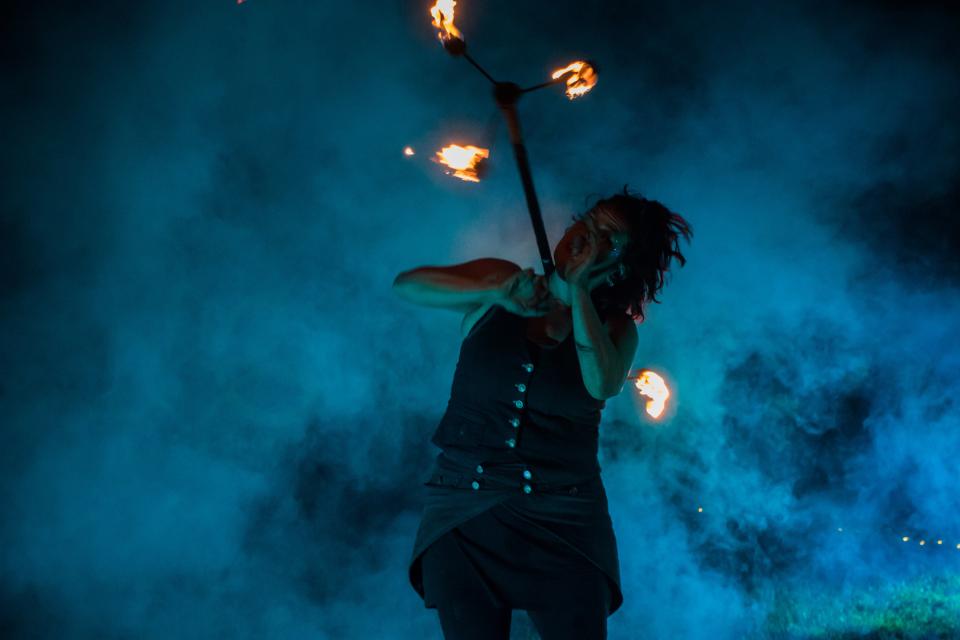 Wir beherrschen eine große Bandbreite an Feuerelementen, die wir mit spektakulären Funkeneffekten ergänzen. So lassen wir zum Beispiel die Poi, brennende Bälle, in leuchtenden Bahnen um uns kreisen, den Dragonstaff brennend über unseren Körper rollen und den Levistick schwebende Illusionen erzeugen. Ferner schaffen wir mit weiteren Tools und Effekten, wie Feuerwolken und dem gigantischen Funkenwirbel, unvergessliche Momente.