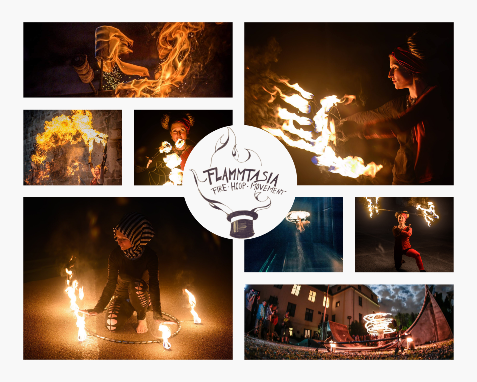 Flammtasia bietet kreative und spektakuläre Feuershows für diverse Veranstaltungen. Als Solo- Duo- oder Gruppenfeuershow buchbar. Anspruchsvolle Choreografien, spielerische Leichtigkeit im Umgang mit den einzelnen Feuerrequisiten, Elegance und pure Lebensfreude bilden die Grundlage der mitreißenden Feuershows. Als besonderes Highlight werden die Shows durch spektakuläre Spezialeffekte abgerundet (brennender Zauberhut, magische Stichflammen und tanzende Funken). Je nach Art der Veranstaltung können brennende Zahlen oder ein brennendes Herz hinzugebucht werden.