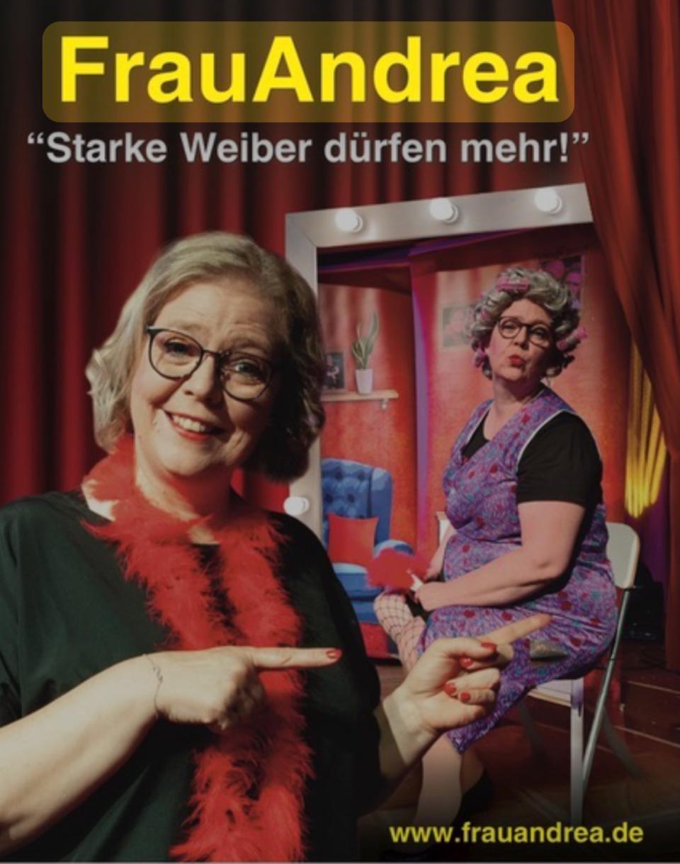 FrauAndrea bekannt aus Funk und Fernsehen, ist Comedian aus Leidenschaft. Sie steht mit beiden Beinen auf der Bühne, genauso wie im Leben. Sie ist Autorin und Mentorin.