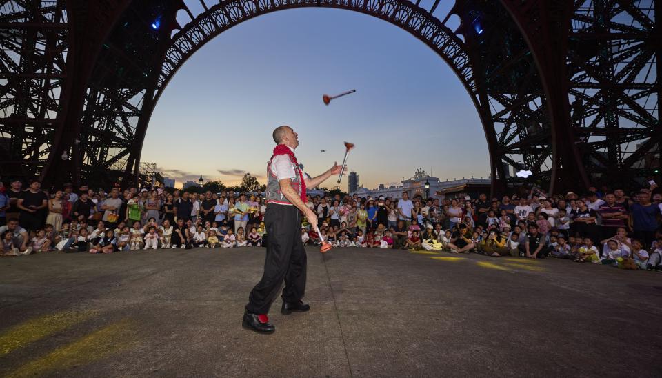 Allein auf der Bühne bringt er eine originelle Show voller Höhe, Hüte und herrlichem Chaos.