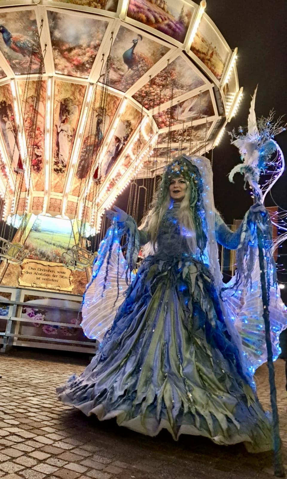 Wehende Umhänge und glitzernde Flügel der Stelzenfiguren schweben über den Köpfen der Gäste… Kesse Feenwesen treiben inmitten des Publikums ihr Schabernack.