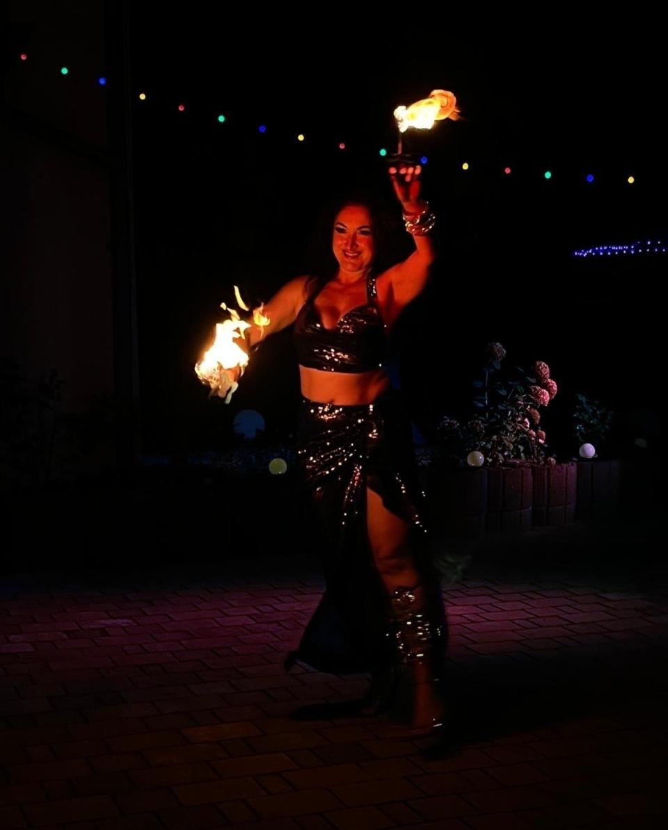 Für zusätzliche Highlights setzt sie gekonnt verschiedene Showelemente ein: Mal schwebt ein Schleier durch die Luft, mal blitzt ein Säbel im Scheinwerferlicht oder ein Kerzentablett tanzt über die Bühne. Als ehemaliges Mitglied des Dresdner Ensembles "1001 Märchen" weiß Julia genau, wie sie ihr Publikum begeistert.