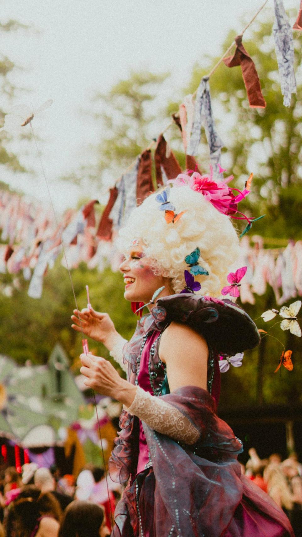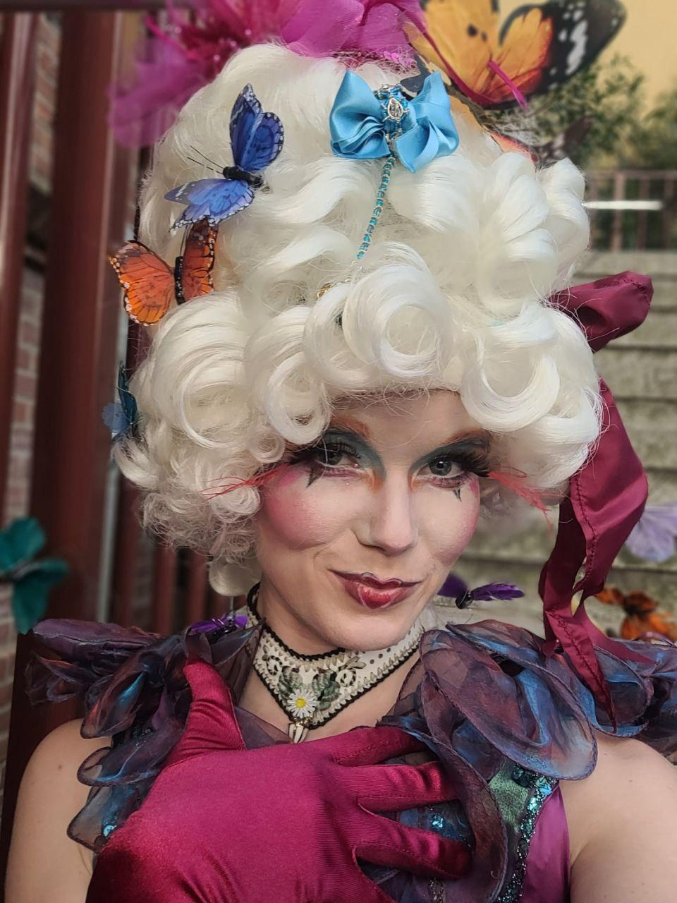Madame Butterfly- Mit ihrem treuen Schmetterlingsbegleiter Fridolin flattert sie förmlich von Ort zu Ort. Farbenfroh und hochgewachsen ist sie der Farbklecks auf jedem Event.