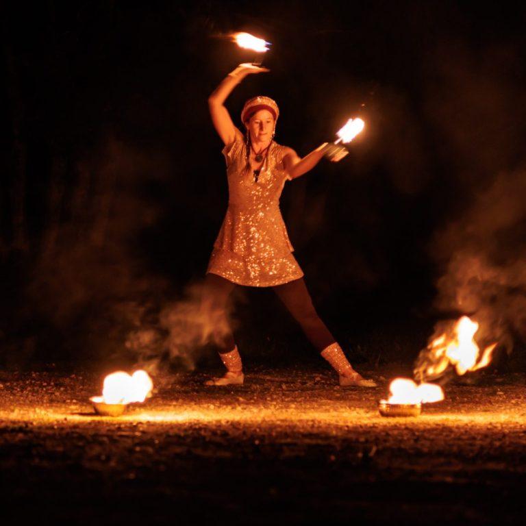 Lass dich faszinieren vom Spiel mit den verschiedenen Feuerelementen: das Handfeuer, die Pois, die Feuerschnüre und den Feuerfächer.
