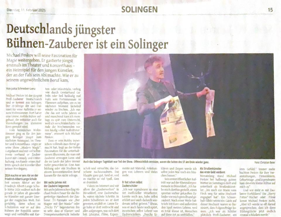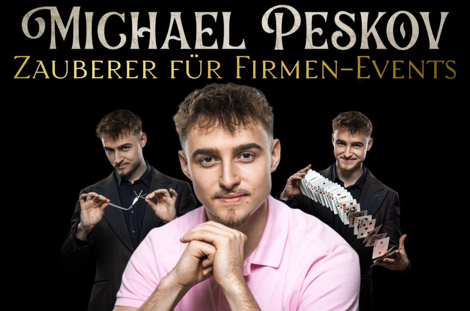 Michael Peskov kommt aus Solingen und ist als einer der jüngsten professionellen Zauberkünstler Deutschlands bekannt (SAT.1, WDR, ZDF, AMAZON PRIME VIDEO). Als er eines Tages durch eine Fernsehsendung sein erstes Kunststück lernte, wusste er bereits mit sechs Jahren, dass er seine Leidenschaft gefunden hat. Seitdem konnte Michael bereits viele Firmen-Events, Hochzeiten und Feiern mit seinen wohl durchdachten Wundern verzaubern. Mittlerweile ist Michael der Meister im Gabelbiegen und holt durch seine junge dynamische Art jeden Zuschauer ab. Er schafft es ganz interaktiv, verblüffend und unterhaltsam sein Publikum in seine Show mit einzubeziehen. Außerdem beherrscht er die Kunst des Taschendiebstahls. Die Flexibilität macht Michael besonders, denn er kann Ihre Gäste hautnah, als Walking-act, oder auf der Bühne verzaubern. Michael sorgt für eine bessere Bindung zu Ihren Gästen (Freunde, Kunden, Mitarbeiter etc.), eliminiert aufkommende Langweile, sorgt dafür, dass Ihre Veranstaltung nachhaltig in Erinnerung bleibt, bietet einen großen Mehrwert und ein unvergleichliches Erlebnis. 100% zuverlässige, unkomplizierte und professionelle Abwicklung. Michael Peskov liefert wesentlich mehr als Unterhaltung ab!