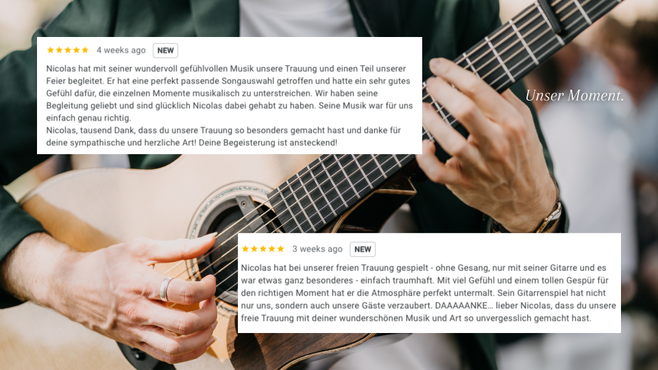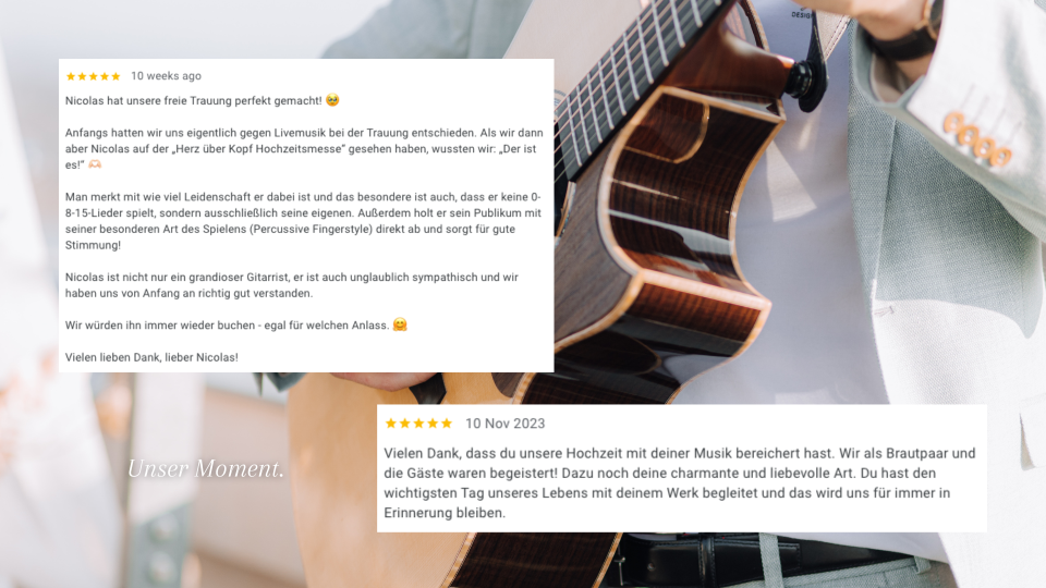 Zahlreiche Referenzen glücklicher Veranstalter und Brautpaare könnt ihr auf meiner Webseite oder meinem Google-Business Profil einsehen.