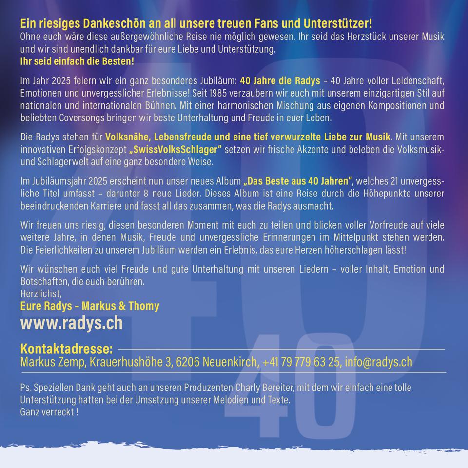 Zum 40-jährigen Jubiläum haben Die Radys am 16. Mai 2025 ihr Album „Das Beste aus 40 Jahren“ veröffentlicht – mit acht neuen Titeln und einer Auswahl ihrer größten Hits.