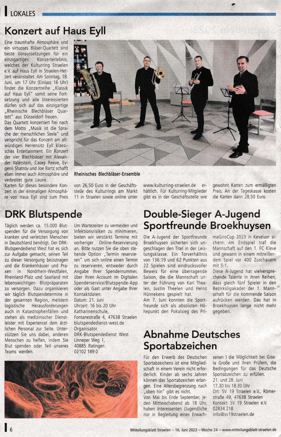 Das „Rheinische Blechbläser Quartett“ ist das professionelle und virtuose Blechbläser Ensemble aus Düsseldorf. Wir lieben es, etwas Besonderes für unser Publikum zu machen. Live-Musik von dem „Rheinischen Blechbläser Quartett“ schafft Atmosphäre und verbreitet gute Laune. Das Quartett steht für klassisches Entertainment. Unabhängig von Strom spielen wir drinnen, draußen, „on Stage“ und mittendrin, als Highlight oder im Hintergrund und passen uns jeder Raumakustik an. Unser individuelles Programm mit Barock, Klassik, Jazz, Volk und Weltmusik spricht alle Sinne an und geht direkt ins Herz.