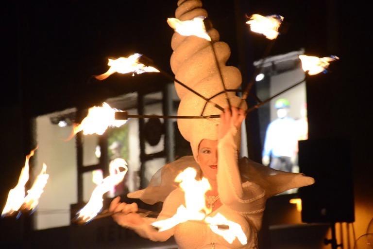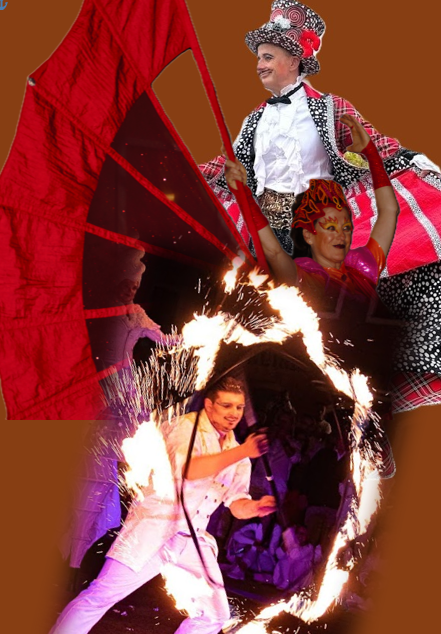 Wir präsentieren auch Feuershows auf Stelzen mit einem befreundeten Feuerartisten am Boden (poetisch oder als Swing Feuershow "Titanic" oder auch als Feuershow zu Weihnachten).