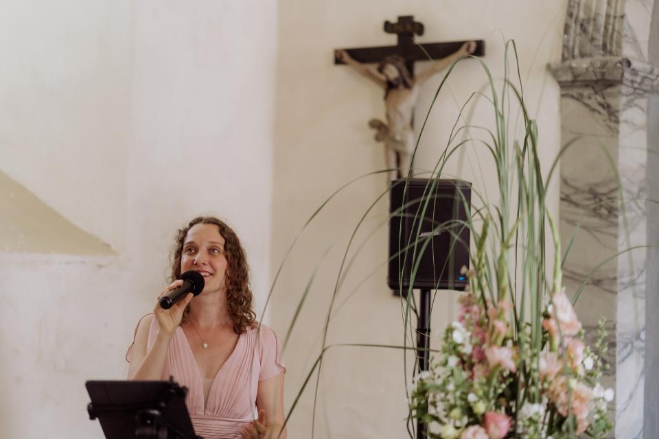 für uns stand von Anfang an fest, dass wir dich am Tage unserer Trauung dabei haben wollen. Die Entscheidung war goldrichtig, denn du hast der Zeremonie mit deiner Stimme sehr viel Magie und Emotionen verliehen und uns alle zu Tränen gerührt. Wir freuen uns sehr, dich auch für unsere kirchliche Trauung noch einmal buchen zu dürfen. Danke auch für deine große gesangliche Begleitung in den letzten Jahren. Du bist nicht nur eine tolle Sängerin, sondern auch ein großartiger Mensch. Bis bald!
