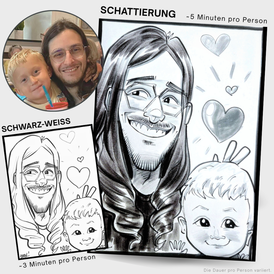 *5 Minuten pro Person sind nur möglich mit Schwarz-Weiß oder mit Schattierung. Farbige Karikaturen können bis zu 10 Minuten pro Person dauern.
