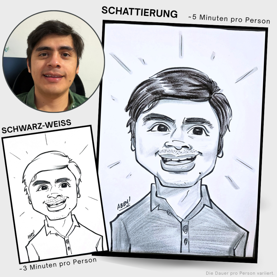 Für Live-Event-Karikaturen biete ich Schnellzeichnungen in Schwarz-Weiß oder mit Schattierung auf A4- oder A3-Papier an. Sowie biete ich farbige Karikaturen an.