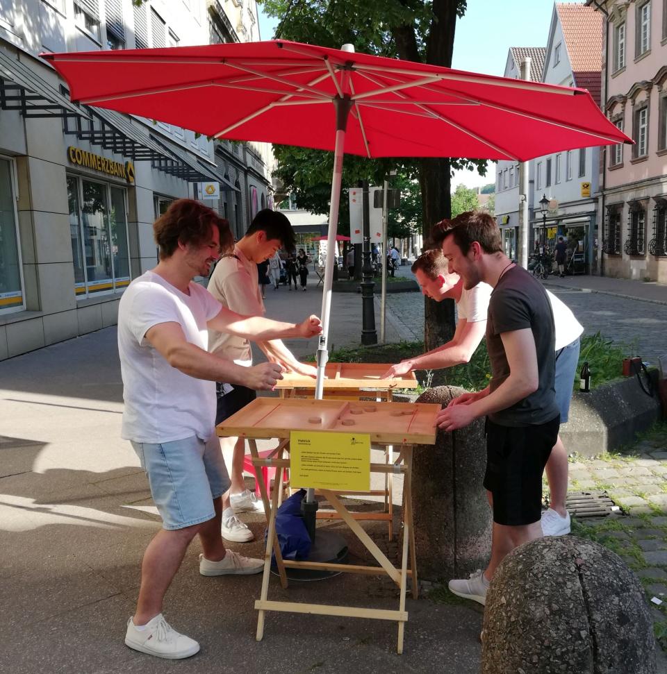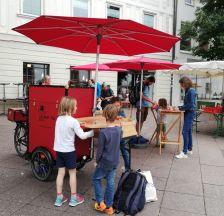 - Das Spielvelo: Das umgebaute Lastenrad beherbergt in seinem roten Kasten Spiele für Kinder und Erwachsene. Spielzusammenstellung nach Wunsch, z.B. 5 Geschicklichkeitsspiele für alle Generationen, 4 Stehtische mit 16 nobelspielen für Erwachsene, 2 Stehtische mit Gesellschaftsspielen für die ganze Familie, 4 Sonnenschirme, 1 Spielleiter*in.