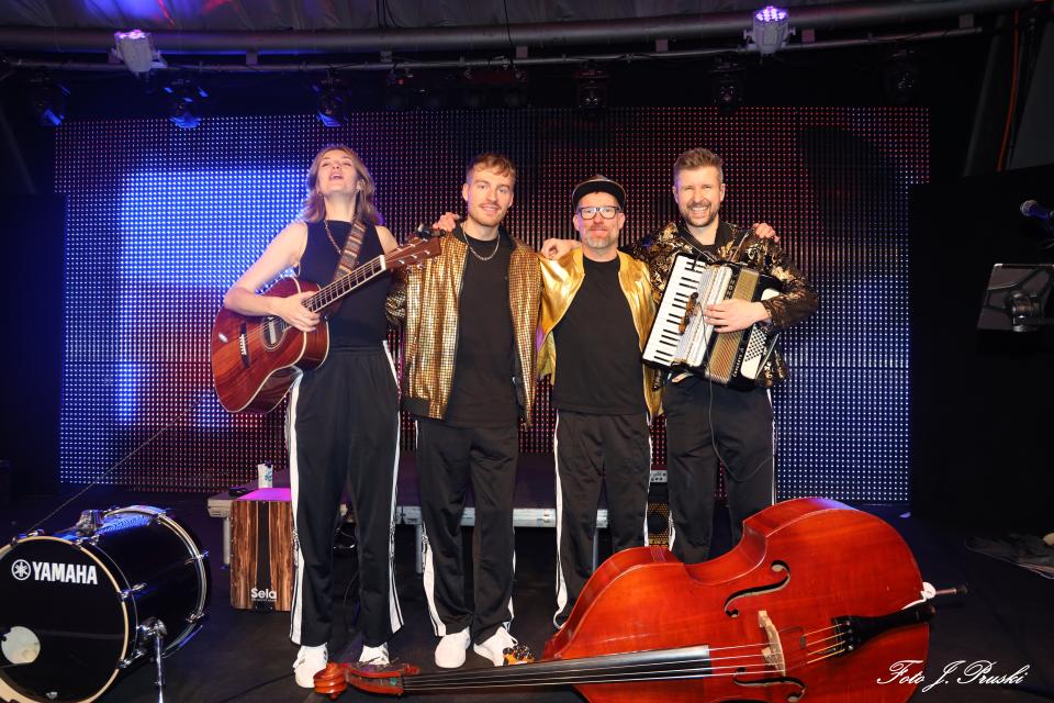 So auch bei uns: Vier Musikerinnen und Musiker, direkt vorn an der Bühne, in einer rein akustischen Besetzung, die man so nicht kommen sieht. Dazu ein modernes Partyprogramm, arrangiert zu einem nahtlos durchgehenden Spannungsbogen, und ein stylish-glamouröser Street-Look.