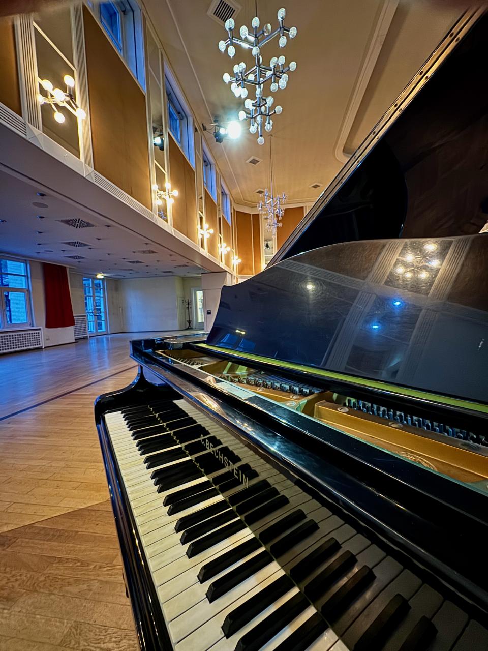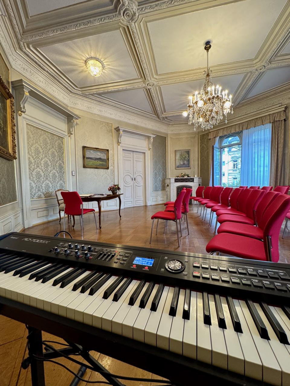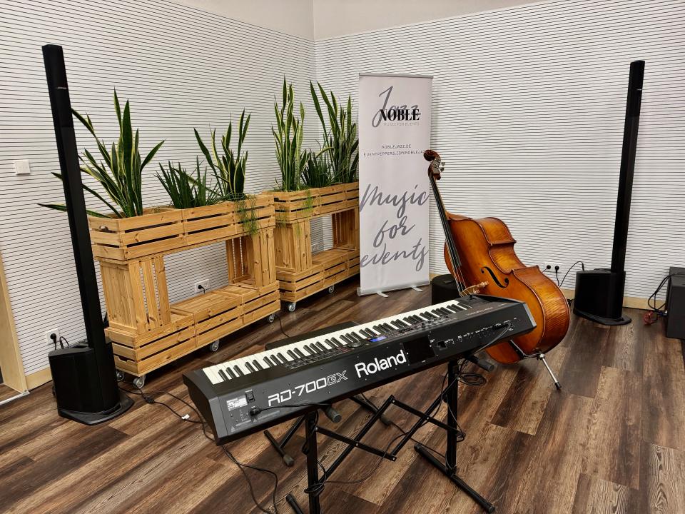 Bei Bedarf kann für Veranstaltungen bis ca. 150 Personen ein E-Piano mit Verstärkungsanlage mitgebracht werden.