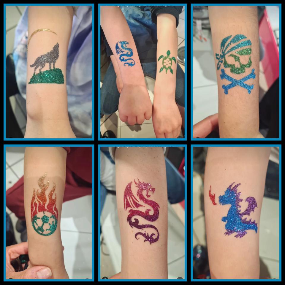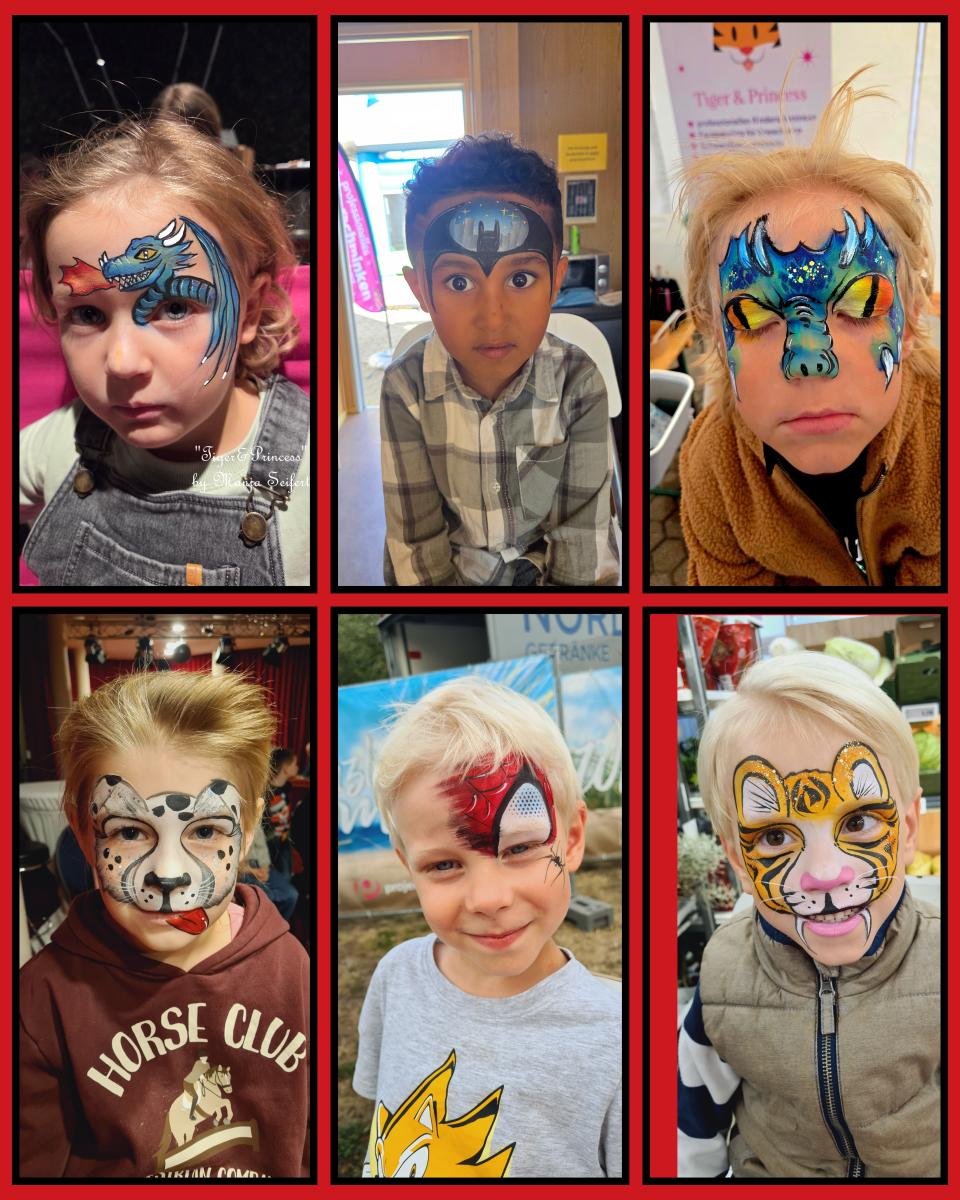 Neben professionellem Kinderschminken biete ich zudem Glitzer-, Ink- und Airbrush-Tattoos, Schwarzlichtschminken, Facepaintings für Erwachsene, meine Glitterbar, kreative Bastelangebote, meine selbst gefertigten Bling Cluster, Bubble Braids und bunte Zöpfe flechten an. Werdende Mütter können bei mir eine Babybauchbemalung oder Gipsabdruckbemalung buchen. Für interessierte Personen biete ich einen individuellen Workshop an, in dem ich die wichtigsten Grundlagen für einen Einstieg in das Kinderschminken vermittle.