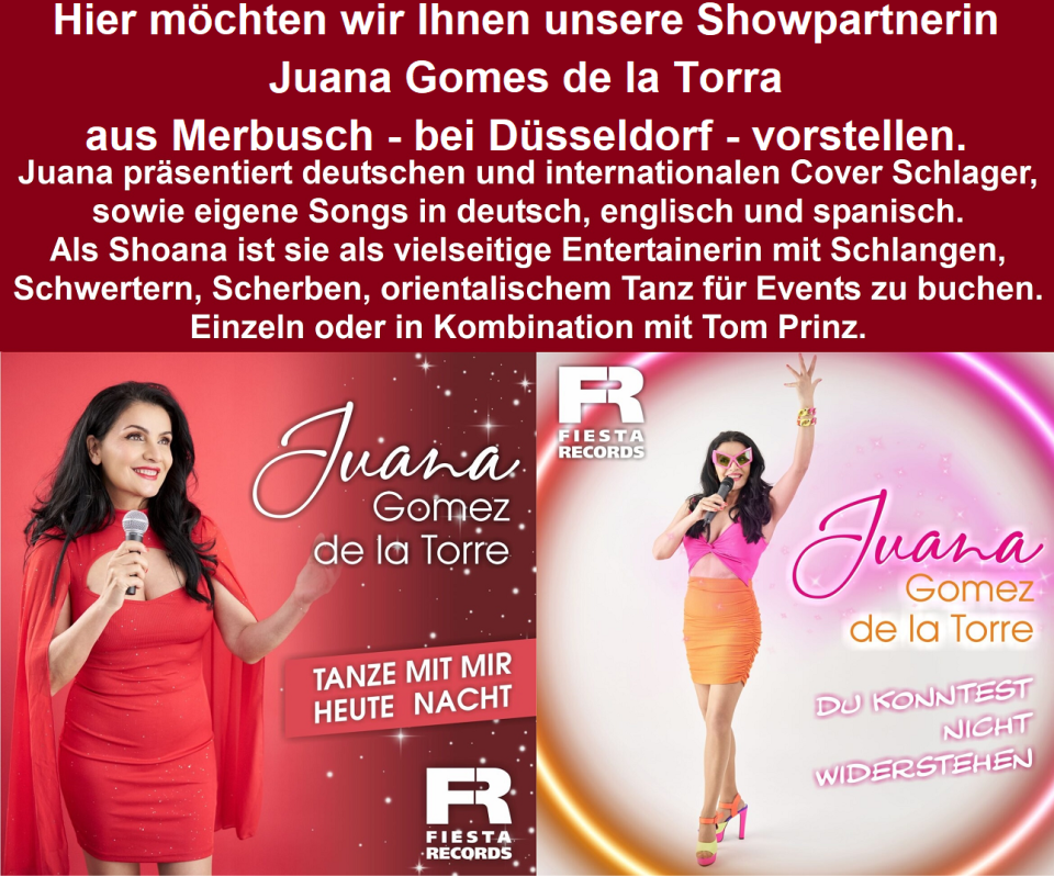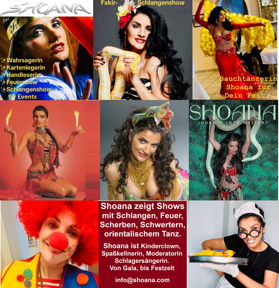 Shoana & Tom Prinz bieten Shows mit Feuer, Schlangen, Scherben, Schwertern, orientalischem Tanz von 45 bis 90 Minuten, für die kleine bis zur ganz großen Feier. Außerdem kann Shoana als Spaßkellnerin oder Kinderclown zu Ihnen kommen.