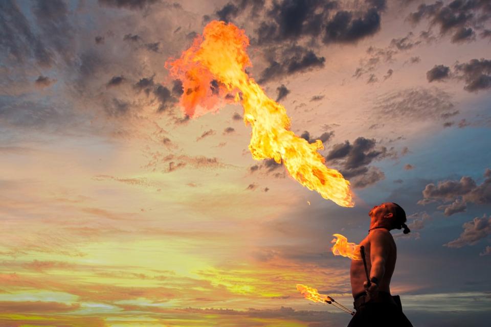 Seltene spezielle Kunststücke wie der Fire transfer, der Magic Puff oder die lebende Kerze entstammen jahrelangem Training und sind dabei absolut kontrolliert und sicher für Ihren Event im Außen- oder Innenbereich.