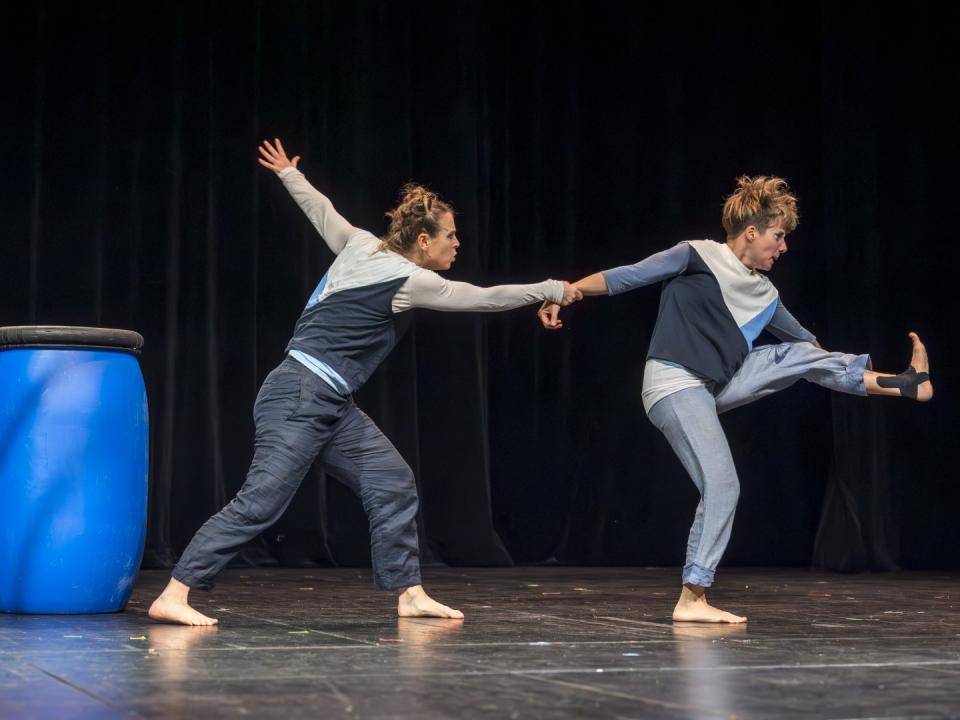 Zusammen mit ihrer blauen Tonne präsentieren sie das Stück "Platz ist in der kleinsten Tonne".