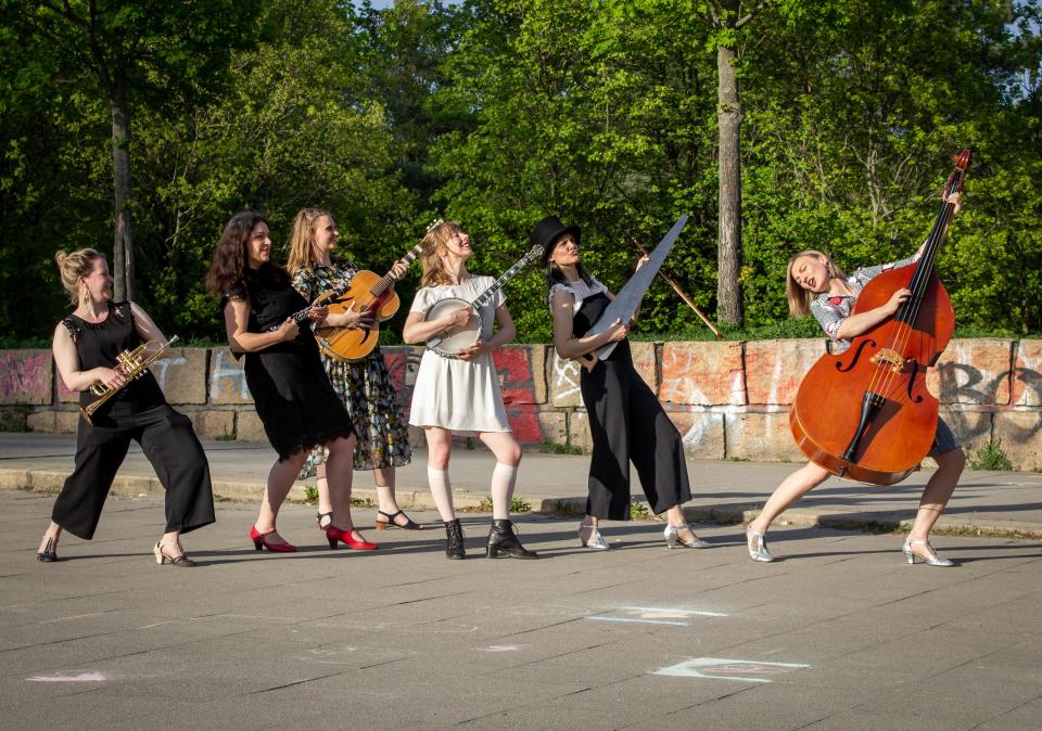 Singende Säge, Trompete, Klarinette, Banjo, Gitarre und Kontrabass werden bereichert durch wechselnden Gesang von allen sechs Musikerinnen!