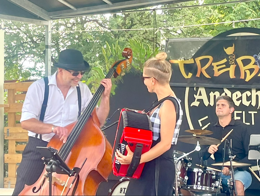 Die unkonventionelle Band-Besetzung setzt das musikalische Temperament perfekt in Szene: den Melodiepart übernehmen Marianna oder Doris an der Geige und Stefan oder Linda am Akkordeon. Für den Rhythmus sind Alex an der Stromgitarre, Matthias am Schlagzeug und Tobi mit seinem Kontrabass zuständig.