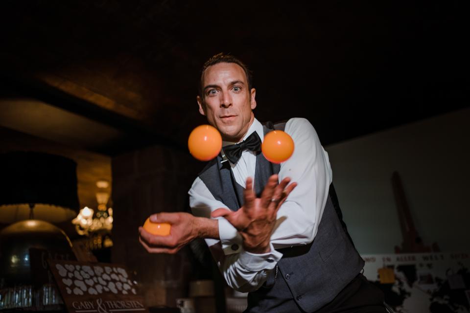 Agentur Bauchgefühl nach einem Kundenevent mit Spaßkellner, Comedyjonglage und Schwarzlichtshow
