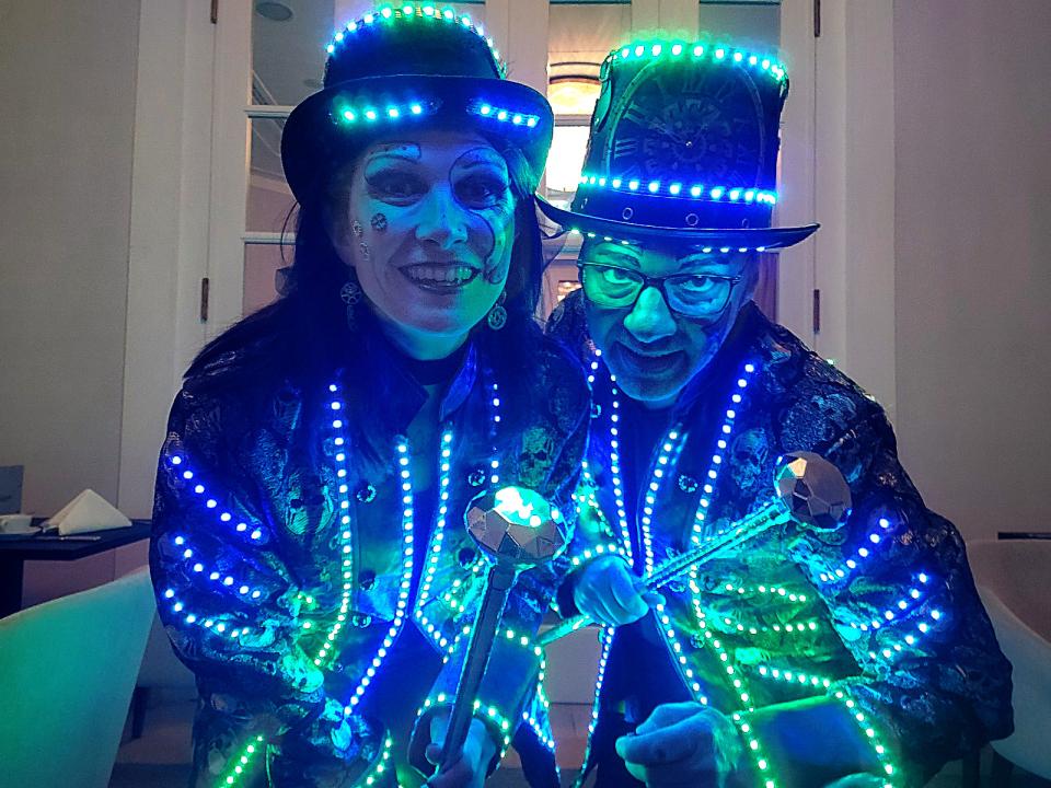 - Als Zeitreisende empfagen wir Ihre Gäste auf Hoverboards und in futuristisch leuchtenden Kostümen.
