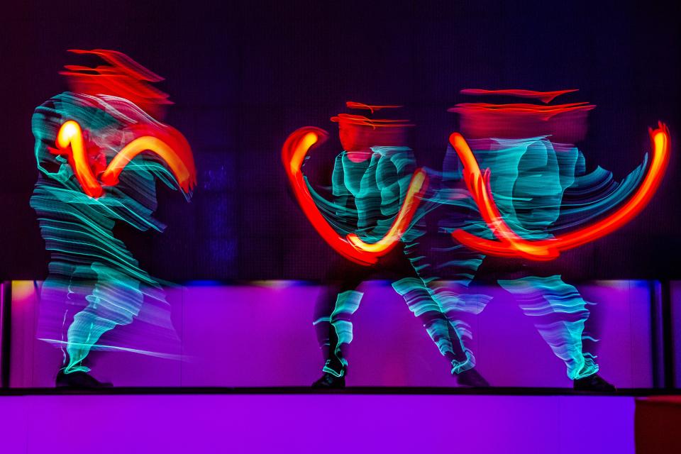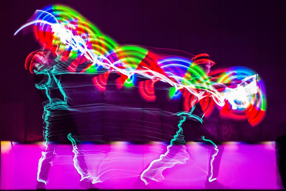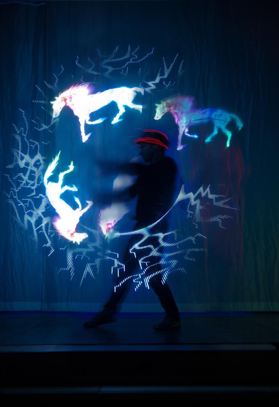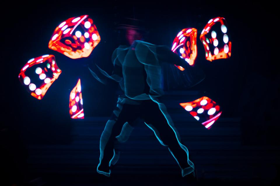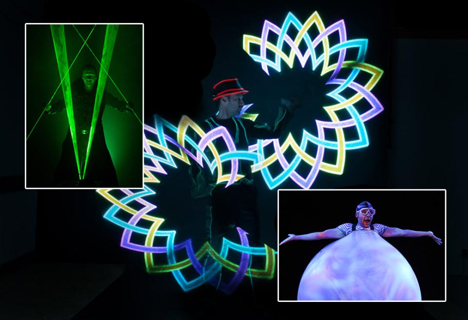 - "LED-show" leuchtende Jonglage zu modernen Beats, eine coole Show mit Einbindung von Fotos und Logos.