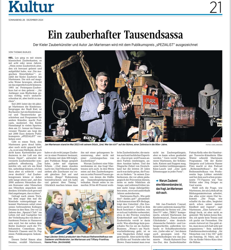 Jan Martensen ist nicht nur preisgekrönter Zauberkünstler und Comedian, sondern auch Autor und Regisseur, unter anderem von Elke Winter, Deutschlands erfolgreichster Live-Travestie-Darbietung. Über seine eigenen Auftritte sagen Rückmeldungen zum Beispiel: