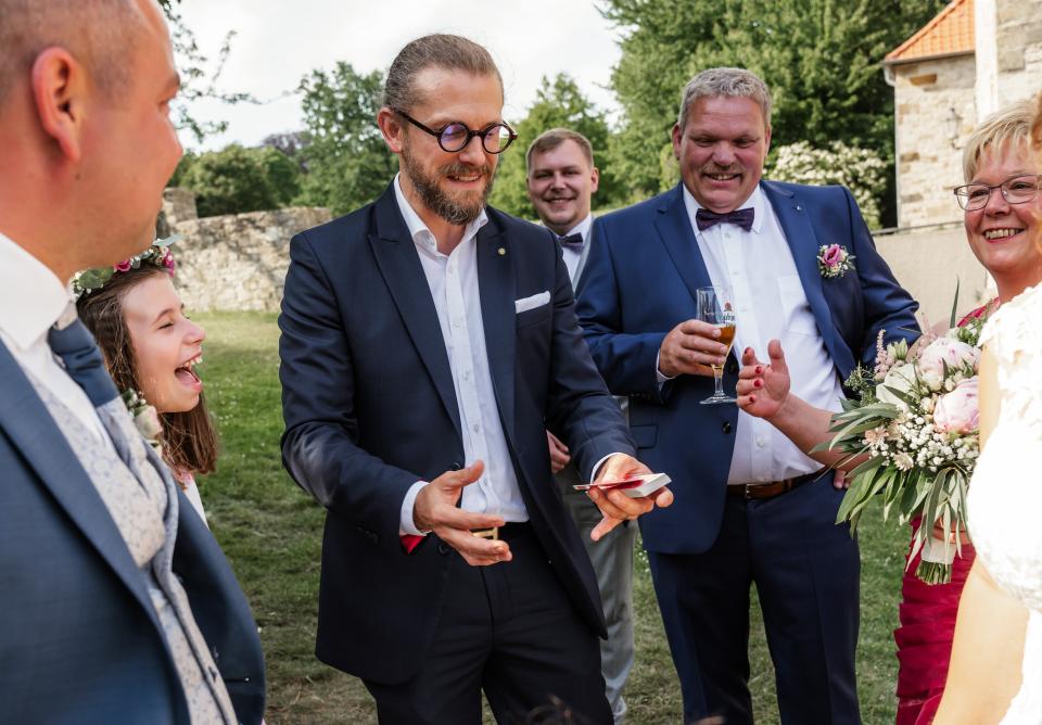 Die Stand-Up-Zauberei findet auf dem Parkett oder auf der Bühne statt. Im Normalfall. Gern kann die Magie aber auch bei Ihnen in der Fabrikationshalle oder im heimischen Garten oder Wohnzimmer stattfinden.