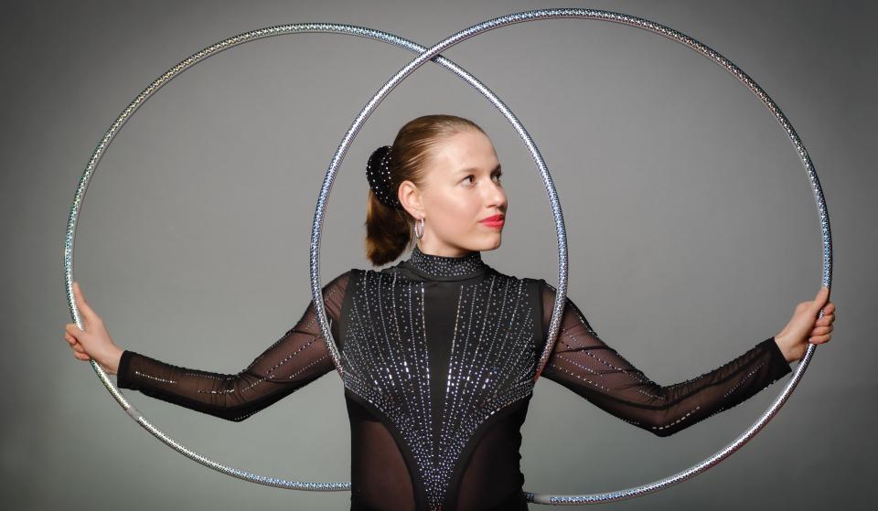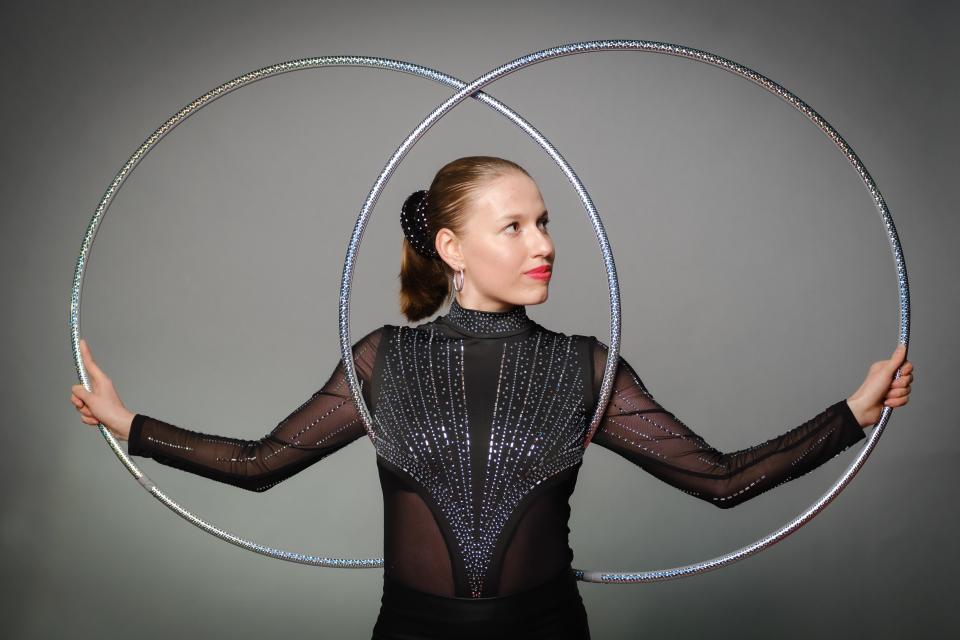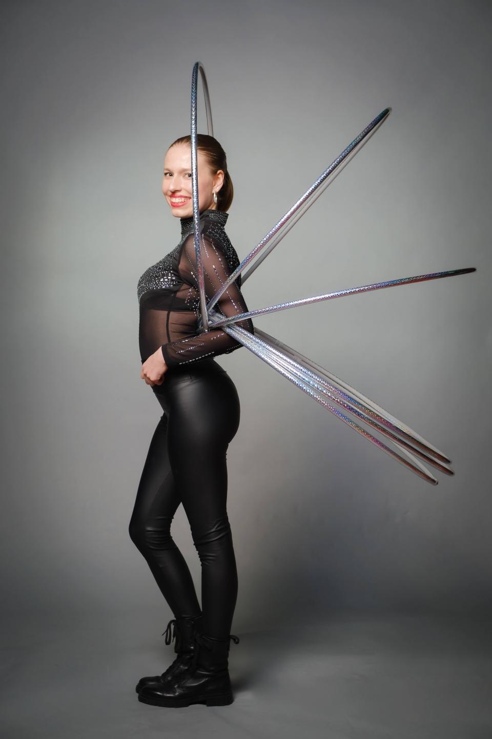 I spin the flying hoops (also known as hula hoops) through the air with seemingly effortless ease, making them appear weightless. The matching lighting effects, the play of colors, and the special aesthetics magically highlight each trick.